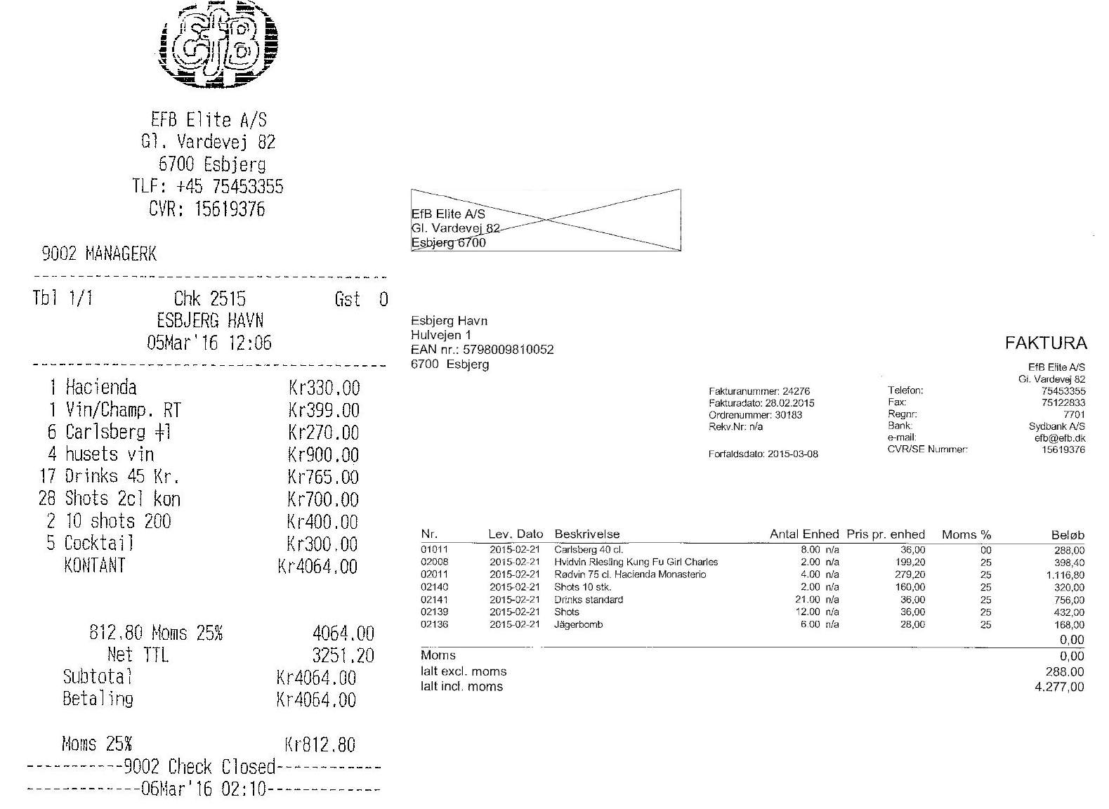 Her drak de 48 shots, 17 drinks, 5 cocktails, 6 flasker vin og 6 Carlsberg-øl, hvilket løb op i 4.064 kroner, eller en smule under, hvad det kostede at sende de unavngivne havnefolk til indendørsturneringen i 2015. Også dette år blev fodbolden skyllet ned med stærk alkohol på skatteydernes regning, hvilket blandt andet drejede sig om Jägermester i shotsform og andre forskellige shots, som blev suppleret med både øl og vin.