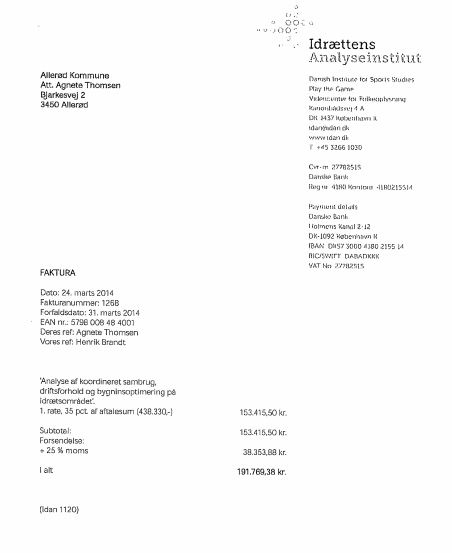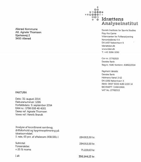 ”Analyse af koordineret sambrug, driftsforhold og bygningsoptimering på idrætsområdet”. En faktura der blev fulgt op i sensommeren 2014, hvor kommunen betalte de resterende 356.144 kroner til Idrættens Analyseinstitut.